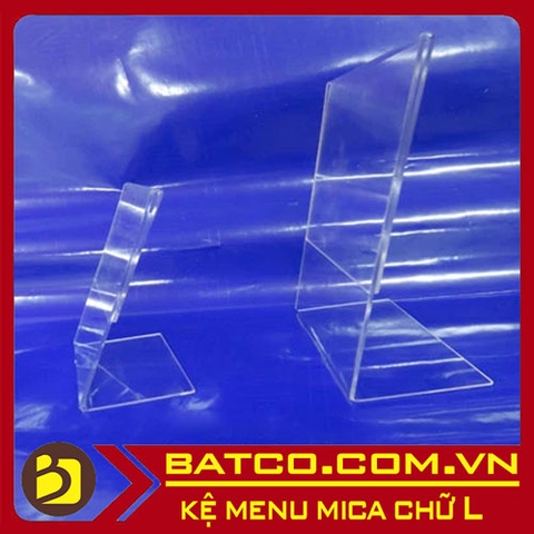 Kệ menu chữ L đứng được làm từ chất liệu mica trong suốt Đài Loan, Nhật Bản độ dày 2mm ; 2,8mm, thiết kế khổ A5, A4 theo yêu cầu của khách hàng.Phần đế và phần thân được uốn liền cố định không tách rời.Loại menu này giúp khách hàng tiết kiệm được vật liệu và chi phí gia công.